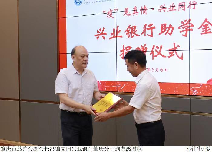 冯锦文、刘香萍分别向兴业银行肇庆分行颁发感谢状,赠送锦旗。