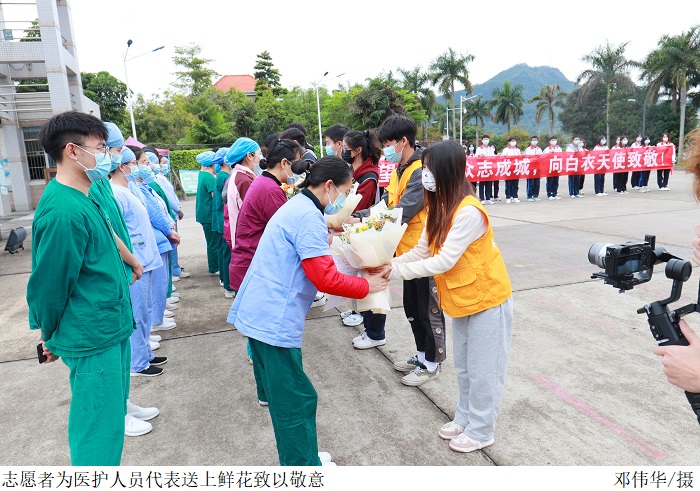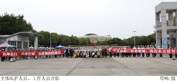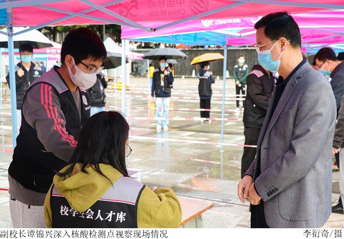 党委副书记张宗珊、副校长谭锦兴带领各相关部门负责人多次深入核酸检测点视察现场情况;关心慰问工作人员;代表学校为奋战在一线的医护人员送上鲜花,致以敬意。