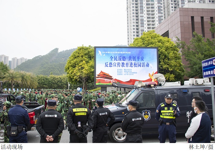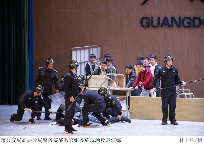 活动现场,师生观看反恐怖宣传教育动漫视频、市公安局高要分局警务实战教官组实施的反恐技能和反恐演练。教官通过现场动作分析与解说,让听讲师生更直观地了解处置细节,指导师生在实际生活中遇到突发事件应如何正确采取相关措施。
