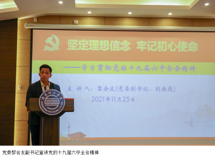本网讯(建设学院 朱斯琪)11月25日下午,校党委副书记黎会友以“坚定理想信念 牢记初心使命——学习贯彻党的十九届六中全会精神”为主题,宣讲党的十九届六中全会精神。建设学院党总支书记周景报主持。经济管理学院、建设学院、会计学院辅导员及学生干部代表参加学习。