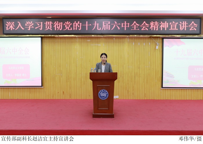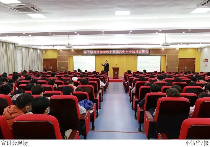 本网讯(宣传部 孟爱静 新闻中心 田嘉乐)12月1日下午,beat365官网在振华楼学术报告厅召开深入学习贯彻党的十九届六中全会精神宣讲会。马克思主义学院副院长李佩琼副教授主讲,党委宣传部赵洁宜副科长主持,200余名学生到场学习。