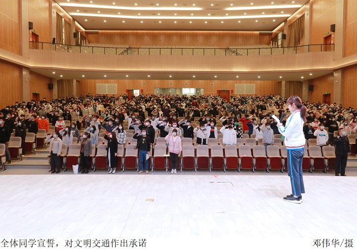 活动中,全体同学宣誓,对文明交通作出承诺。