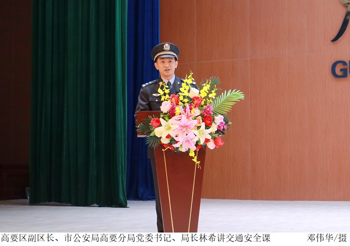 高要区副区长、市公安局高要分局党委书记、局长林希为参与活动的同学们上了一堂生动有趣的交通安全教育课。林希局长以《清明上河图》结合典型事故案例,引出“礼是鼓励人们应该怎样做的规范,是绿线;法是规定了人们不能怎样做的底线,是人们行为的红线。”从全新的视角解读“守法规知礼让、安全文明出行”这一宣传主题,传达文明交通理念,以案释法,深入浅出地向学生们讲解违反交规的危害。
