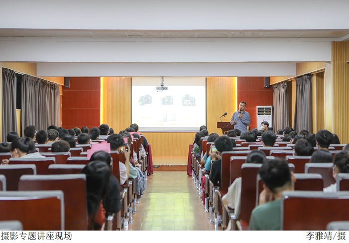 康庆新老师在讲座中从相机的功能和基本结构、摄影的构图方法、会议及大型活动拍摄技巧及注意事项等进行了专业介绍。他以大量的会议、活动、人物等方面的照片为实例,对摄影的取景构图、创作方法等进行了重点讲解。随后点评了摄影爱好者们上交的校园摄影作品,针对每一张照片,从构图、用光,到表现形式和内容进行一一讲解,并就现场师生提出的问题给予详细解答。