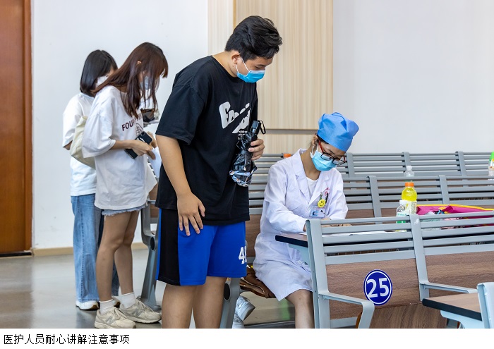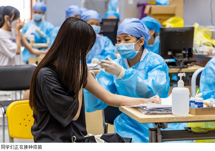 接种现场,师生佩戴口罩,在志愿者的引导下有序进行体温测量、医疗人员咨询、身份信息登记等流程。医护人员身穿防护服,高强度工作十几个小时,只为做好疫苗接种工作,全力保障新冠肺炎疫苗接种工作的顺利开展,确保疫苗接种规范、安全,构筑好校园免疫屏障。