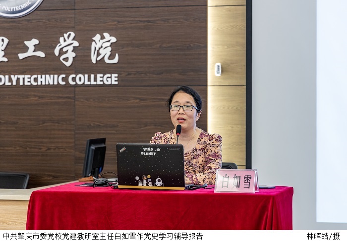 中共肇庆市委党校党建教研室主任、肇庆市党建学会副秘书长白如雪同志以“探寻百年初心,牢记强国使命”为题,发表了重要演讲。她以党的发展史为线索,从多方面展现中国共产党的光荣事迹;随后就新时代中国所面临的机遇好挑战,进行详细阐述。