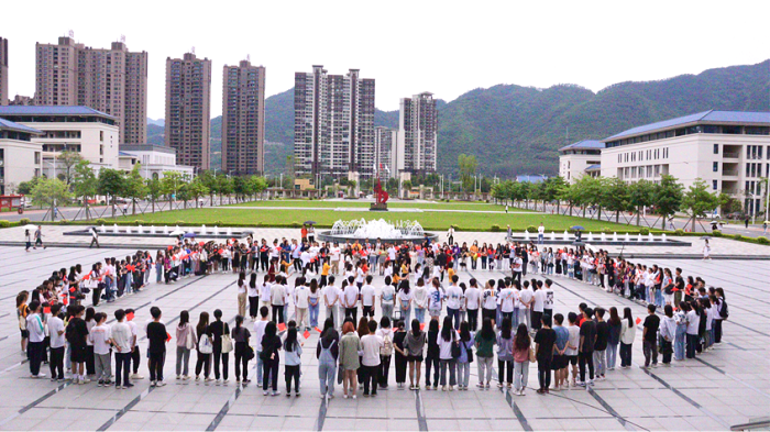 本网讯(经济管理学院)为庆祝建党100周年,弘扬五四精神,4月29日中午,“青春心向党,争做新青年”主题青春快闪活动在鼎湖校区行政楼前举行。经济管理学院党总支吴楚升副书记、团委学生会赵丹丹书记及全体辅导员老师以及学生志愿者们共同参与此次活动。