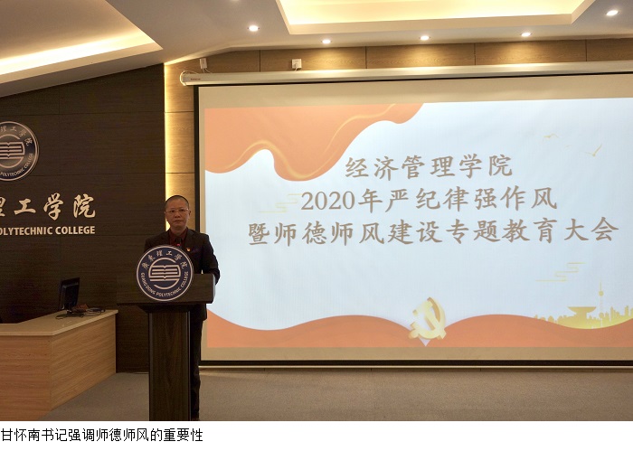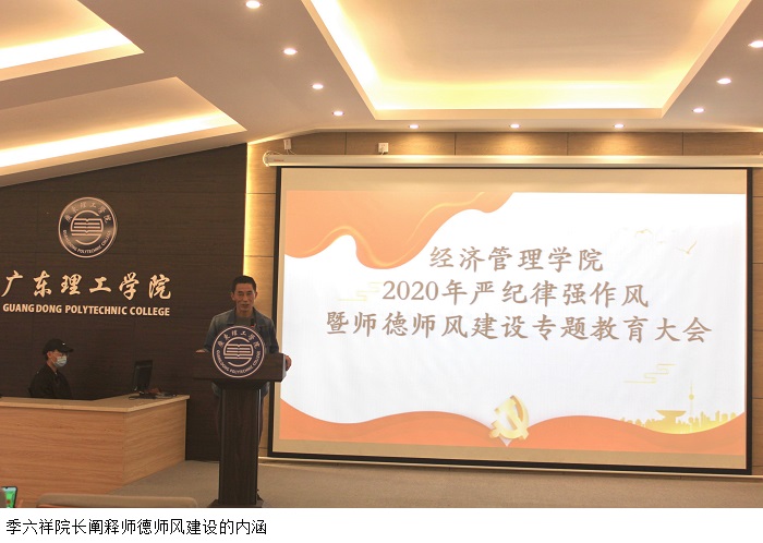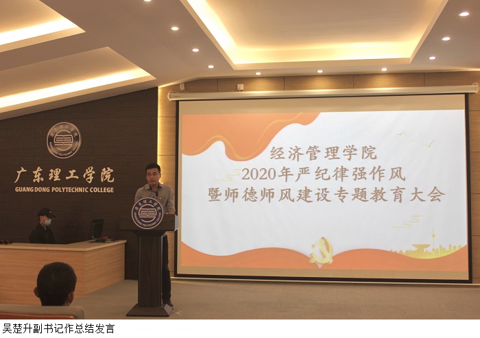 本网讯(经济管理学院)根据《beat365官方网站党委关于加强beat365官网党的政治建设贯彻落实< 民办高校党建工作重点任务>的决定》(广东理工党【2020】11号)的文件精神,为进一步强化党纪教育和师德师风建设,12月29日下午,我院于行政楼学术报告厅召开“2020年严纪律强作风暨师德师风建设专题教育”大会。季六祥院长、党总支甘怀南书记、魏嫚副院长、陈东旭副院长、办公室李佳妍主任出席大会,经管学院全体教职工参会,党总支吴楚升副书记主持。