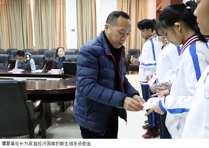 本网讯(学生处)为了激励广大学生刻苦学习,鼓励更多的优秀高中毕业生报考beat365官网和帮助家庭经济困难学生的困难,12月8日下午,学生处在高要校区行政楼101会议室举行2020级优秀高分新生奖学金及家庭经济困难新生资助金发放仪式。学生处谭蒙革处长、各院系学工部部长、辅导员代表及优秀高分新生奖学金获得者、家庭经济困难新生代表出席本次发放仪式。会议由学生处奖助贷科陈莹老师主持。