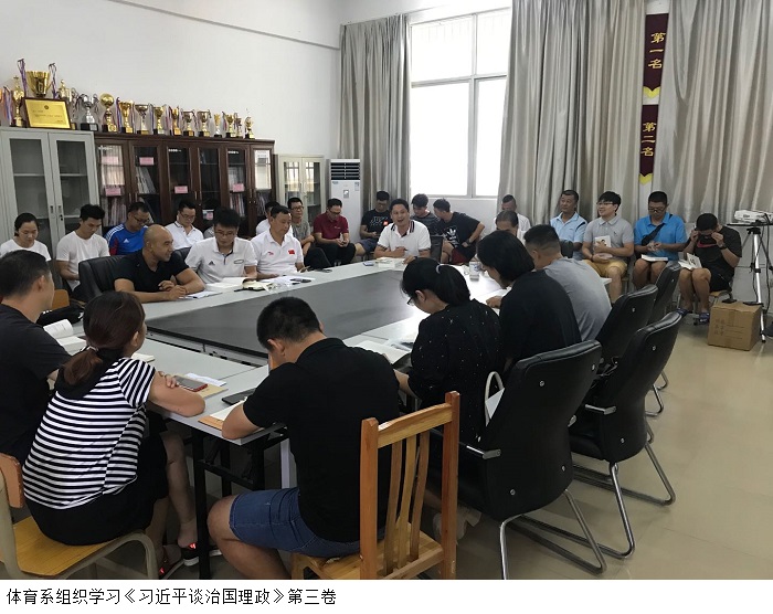 本网讯(体育系)筑牢信仰之基,补足精神之钙,把握思想之舵。根据《beat365官方网站党委2020年党建工作计划》的要求,各支部严格落实“三会一课”制度,坚持推动党员干部增强“四个意识”,坚定“四个自信”,坚决做到“两个维护”。 9月15日,体育系在36栋104室开展《习近平谈治国理政》第三卷学习会,会议由党支部书记刘海粟主持。