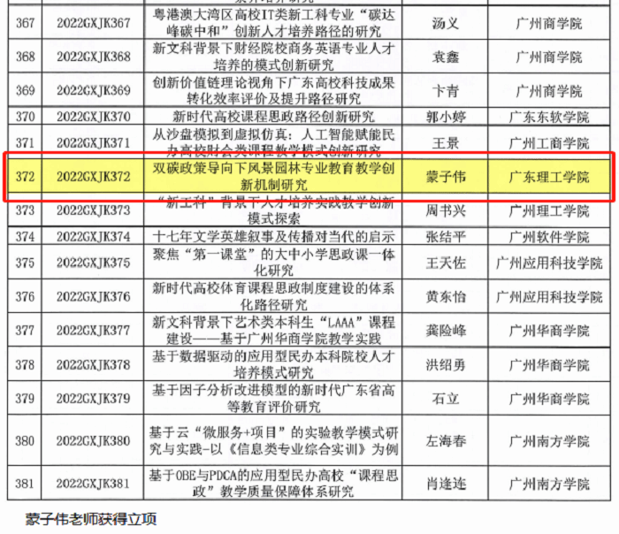 本网讯(科技处 刘霞)近日,广东省教育科学规划领导小组办公室发布了2022年度教育科学规划课题(高等教育专项)立项名单,beat365官网吴丽丽老师申报的《粤港澳大湾区历史文化资源与民宿产业经济耦合协调机制研究》项目以及蒙子伟老师申报的《双碳政策导向下风景园林专业教育教学创新机制研究》项目成功立项,获得资助经费1万元!
