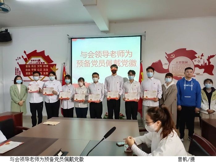 会议在庄严的国歌声中拉开了帷幕。叶家宜代表党组织宣读了29名预备党员人员名单。与会领导老师为预备党员佩戴党徽、发放贺卡。在胡涵的领誓下,新发展预备党员举起右手,面向党旗,用铿锵有力的声音进行入党宣誓,表达了为共产主义奋斗终身的决心。