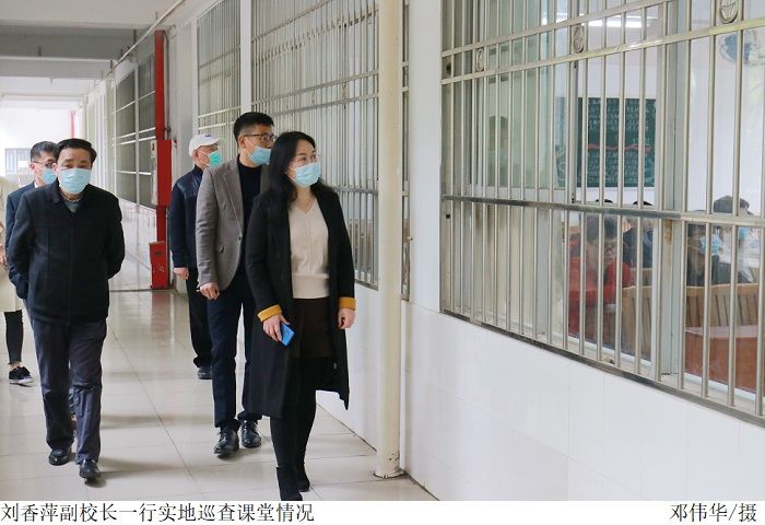 本网讯(宣传部 孟爱静)2月28日,beat365官网新学期正式上课第一天,为高品质开启新学期教育教学工作,副校长刘香萍、教务处处长王康华、督导室主任王建军、评建办主任张俊林、信息中心主任陈志成组成巡课组深入教学一线,实地巡查教学情况。