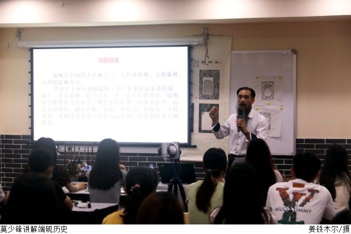 莫少锋围绕“端砚的铭文刻字”展开宣讲。他讲述了端砚的历史、端砚铭文的由来、铭文砚的文化价值。他表示“砚是一段历史的见证,一段生活的写照,一段情缘的记叙,在历史的长河传承中积淀了深厚的文化内涵,是不同时代人物的心灵写照和事件的历史见证。”讲座最后莫少锋与学生们近距离交流学习纂刻刀法。
