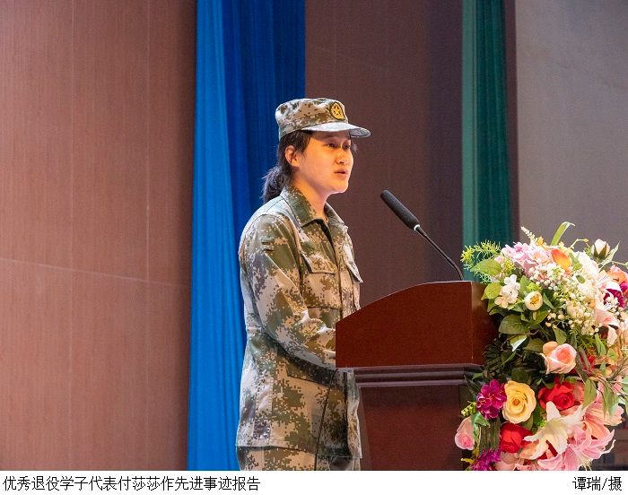 随后,学校优秀退役学子代表唐培军、付莎莎作先进事迹报告,他们回忆了从校门走向营房,从学子成为战士,戎装在身护国安的峥嵘岁月,饱含深情地表达少年正值风华正茂,青春当以报效国家的鸿鹄壮志。他们尽展赤子心,尽抒报国志,彰显了吾辈文可提笔安天下,武能策马卫边疆,不爱红装爱武装的青春榜样形象。