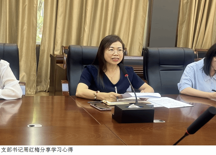 周红梅以《学习贯彻习近平总书记视察广东重要指示精神,立足岗位积极进取促进学校高质量发展》为题结合工作实际谈学习体会,她提出总书记视察广东重要讲话重要指示精神具有很强的政治性、战略性、指导性、针对性,是广东奋进新征程的行动指南和力量源泉,让广大干部群众倍感振奋、深受鼓舞。作为党员,我们需立足岗位,积极进取,继续做好榜样起好带头作用,为学校高质量发展贡献力量,凝聚起广东高质量发展的磅礴力量,为广东“在推进中国式现代化建设中走在前列”作出更大贡献,全面落实习近平总书记的指示精神。教务处始终坚持正确的方向,坚持以教学工作为核心,坚持把握学校应用型本科办学定位,在课程建设、实践教学、质量工程与教学改革立项等方面取得了重大硕果,大力促进学校高质量发展。党支部宣传委员黄冬梅以《深入学习习近平总书记视察广东重要指示精神,为学校培养高素质应用型人才凝心聚力》为题谈学习体会。
