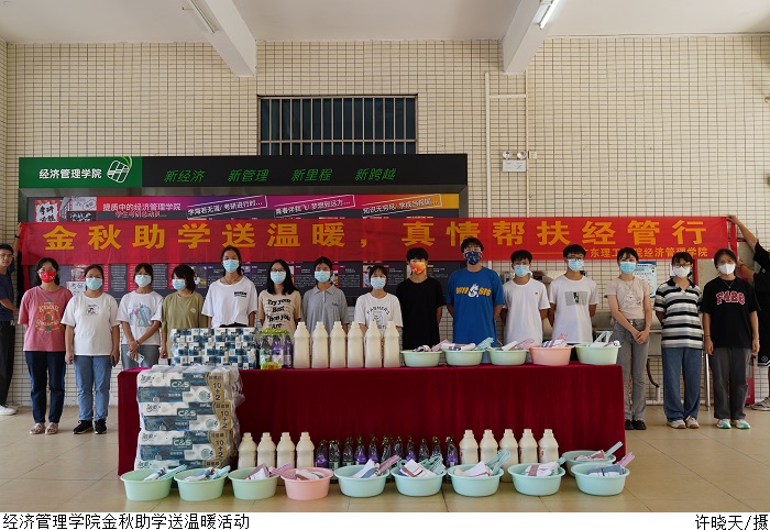 吴楚升介绍了政府和学校的资助政策。随后,老师为经管困难学子发放中秋应节物品、生活日用品等暖心物资。