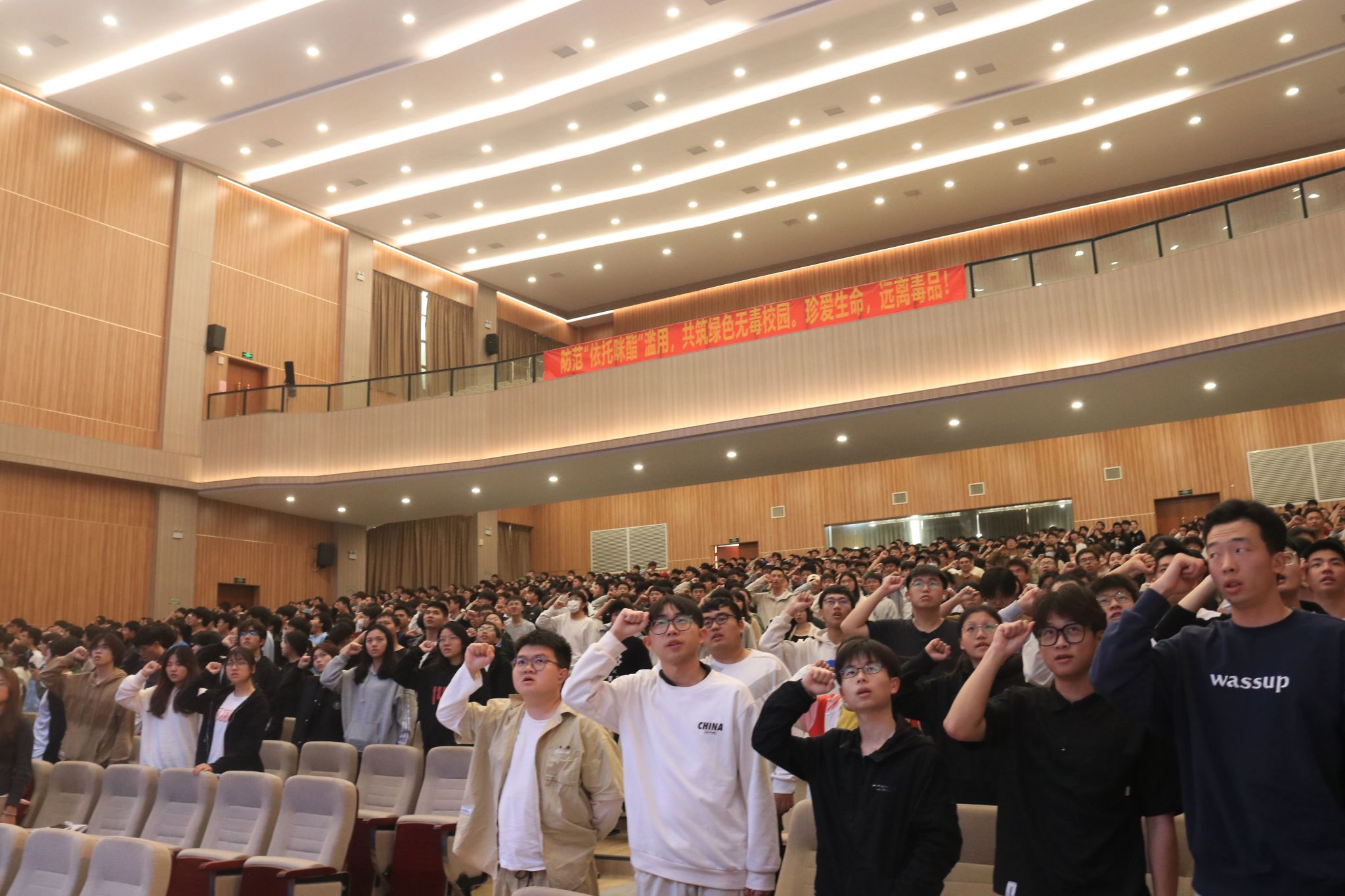 在李招德副会长的带领下,全体师生庄严宣誓。铿锵有力的声音彰显了新时代青年参与禁毒、宣传禁毒、抵制毒品、积极向上的坚定决心!