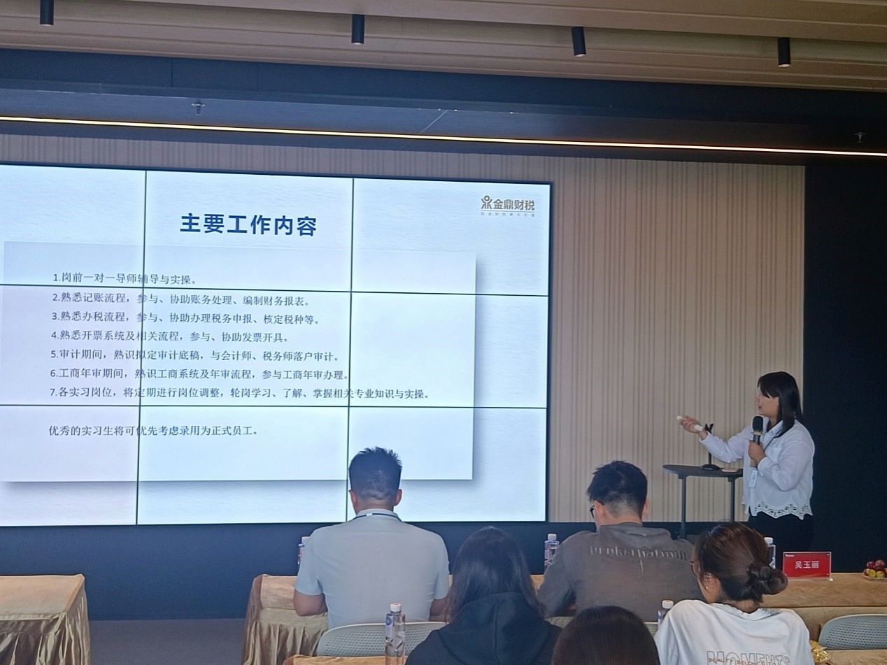 在交流互动提问环节,学生们积极踊跃,问题涵盖了实习要求、职业技能提升、行业发展前景等多个方面,郑经理一一耐心解答,现场气氛热烈而融洽,这让他们更加明确自己的职业规划。期间还邀请了目前正在集团实习的会计学院师姐,她分享了自己在佛山金鼎财税集团的实习生经历,这为会计学院学生提供了宝贵的经验借鉴,让他们更加明确了自己在学习和实践中的方向和目标。