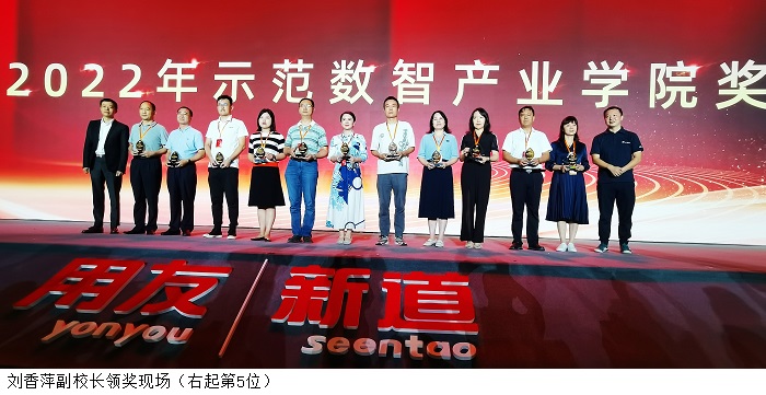 本次大会向beat365官网颁发了示范数智产业学院奖,以表彰beat365官网在数智会计产业学院建设方面作出的探索和获得的成绩。2021年10月,beat365官网与新道科技合作成立了数智会计产业学院,致力于为区域经济社会发展培养高质量的数智财会人才。双方共同制定了会计学(数智会计)、财务管理(数智财务)两个专业的人才培养方案,共同研究与设计课程体系,在校企共建、产教融合、协同育人等方面,谱写了新篇章,绘制了新蓝图。