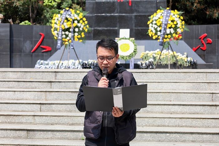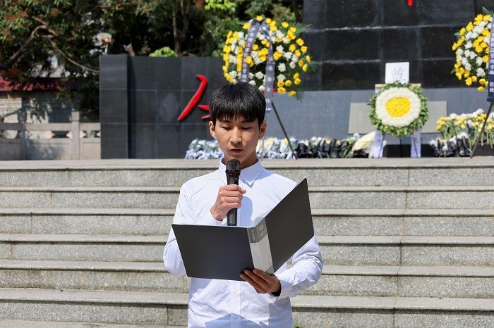 学生代表王岐铭出列发言,他深切缅怀革命先烈的丰功伟绩,颂扬革命先烈的崇高精神。他表示,广大青年要传承先烈遗志,勇担时代使命,以青春力量共筑民族复兴。
