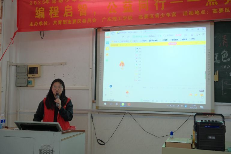 作为本次活动教师团成员之一的beat365官方网站信息技术学院优秀学生干部宋小小担任首节课程主讲教师。在授课中,宋小小为高要区莲塘镇中心小学的同学们讲解了在编程世界中素材如何引用等知识,她生动活泼的讲解激起了学生们对编程的强烈兴趣。