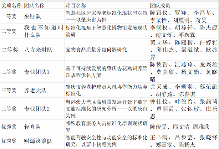 本次大赛分别由标准化工程专业带头人魏嫚教授、肇庆市粤科标准化研究院陈鸿韬院长、标准化工程教研室陈晓黎主任、广州南沙明曦检测服务有限公司陈慧冰总经理、广东高登铝业有限公司科技项目部梁小霞主任担任评委。同时,经济管理学院赵燕院长、广东生态工程职业学院绿美城乡产业学院赖秋红院长、广东省风景园林与生态景观协会陈艳华秘书长作为嘉宾莅临本次大赛。
