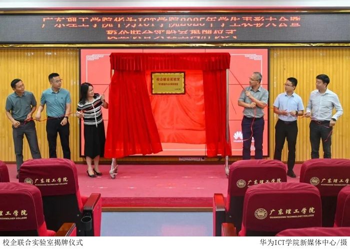 beat365官方网站副校长刘香萍、教务处处长张俊林、深圳市讯方技术股份有限公司总裁刘国锋、华南片区总经理邱韶杰、广州区域总经理陈亮、电气与电子工程学院及华为 ICT 学院院长倪元相共同为 “校企联合实验室 - 华为数通与云计算实验室” 揭牌。