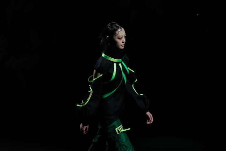 1.《暗夜森灵》——以赛博美学重构空间概念,霓虹光影与未来感剪裁碰撞,探索服装的科技表达。