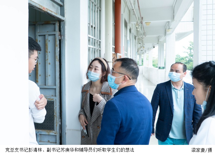 彭清林一行前往西区11栋,查看学生宿舍,并与同学们亲切交谈,详细了解他们生活、学习等情况。彭清林对同学们说,当前是疫情防控工作的关键时刻,线上学习对于师生来说都是一个挑战,同学们要听从各任课老师的线上教学安排,认真完成课程学习,另外还要自觉履行个人防护责任和措施,增强自我防范意识。