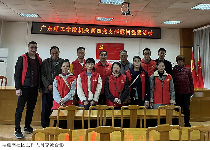 下午三时,在蕉园社区工作人员的陪同下,机关第四党支部全体人员分别走访看望了社区内的低保户及部分困难群众家庭,在这个寒冷的冬日给他们送上慰问品和温暖的问候,关心他们的生活情况和身体状况。