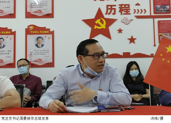 周景报强调党员教师要以实际行动弘扬伟大建党精神,结合当前校园疫情防控工作,充分发挥党员旗帜作用,为无疫校园尽力、分责。