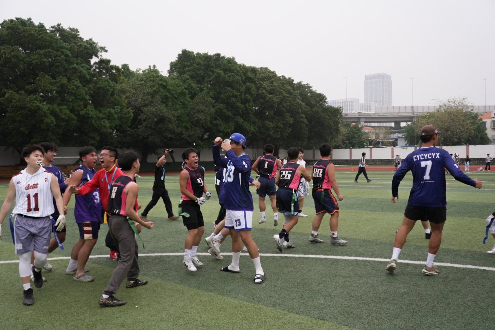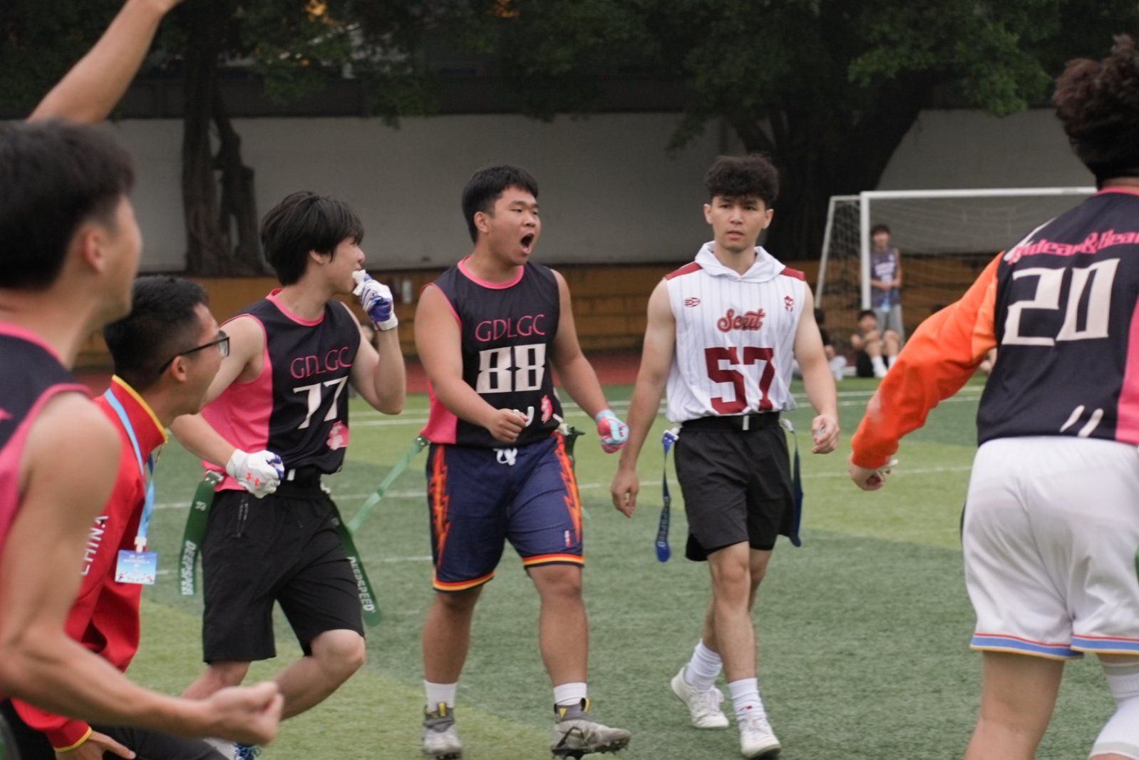 男子甲组的比赛堪称惊心动魄。首场小组赛,beat365官网迎战传统劲旅广州软件学院,双方战至加时,关键时刻队长灵活调整战术,采用“分散跑位+假视野传球”策略成功达阵,防守组紧逼施压,最终以微弱优势取胜。第二场小组赛同样胶着,加时赛中球队凭借默契配合再下一城,强势晋级决赛。决赛对阵华南理工大学,比赛一度陷入被动。面对对手的“走表战术”消耗时间,beat365官网在落后一分的危急关头,第二四分卫临危受命,率领新进攻阵容快速推进,最终以一记精准传球达阵追平比分,并在附加分阶段完成制胜一击,以7:6实现惊天逆转。夺冠瞬间,全场沸腾,队员们以标志性庆祝动作点燃赛场。