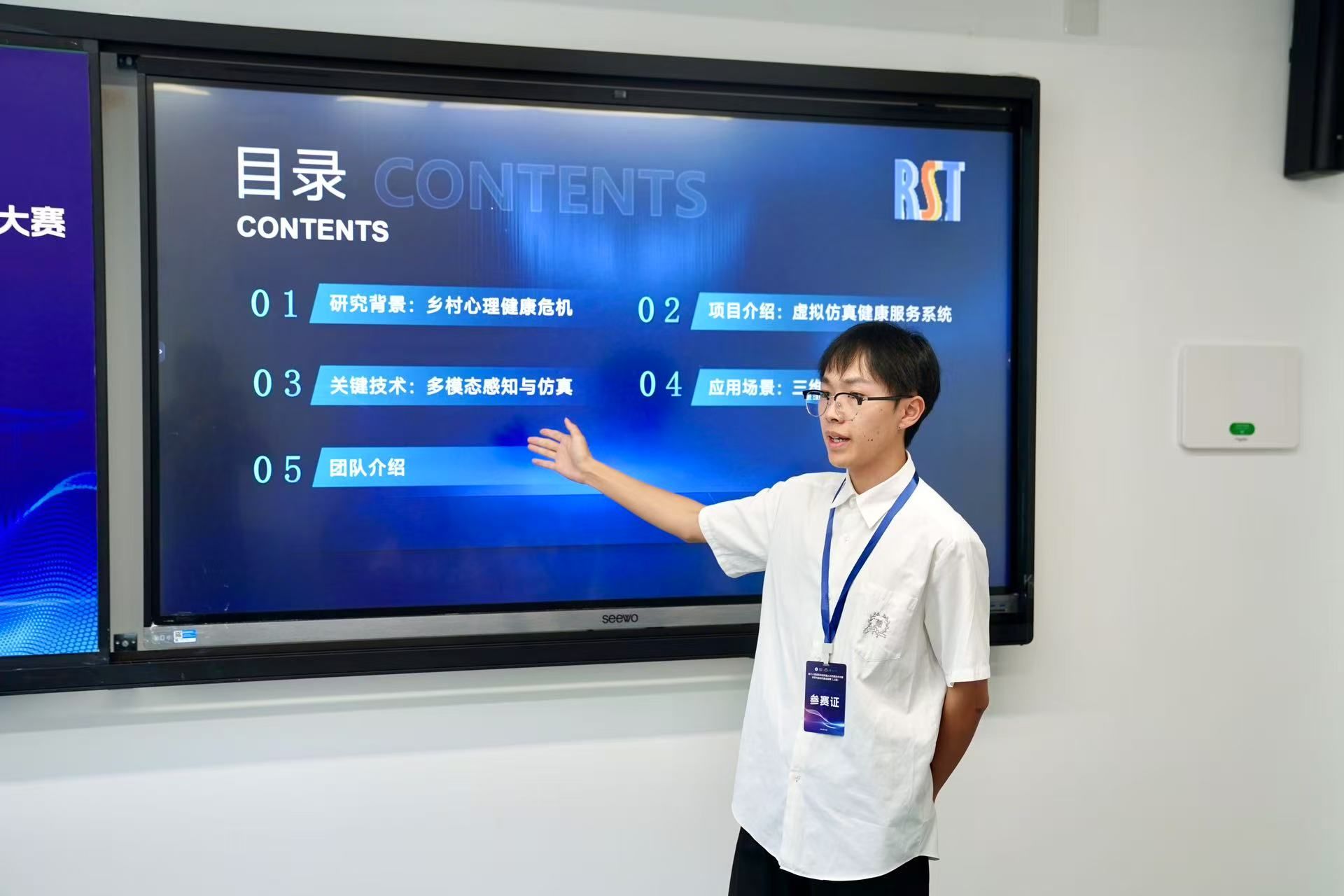 在7月15-16日的展示环节,参赛队伍分别在健康服务系统虚拟仿真、运动与人机交互方案、智慧体育教学与训练模拟、AI+体育知识科普创意四大赛道依次亮相。beat365官方网站“体育与运动仿真战队”的作品聚焦乡村青少年心理健康,借助XR与数字孪生技术复刻鼎湖山湿地等自然场景;学生沉浸体验的同时,系统实时采集心率变异性、皮电等生理指标,动态推送正念呼吸引导并自动调节任务难度,最终生成专注力与情绪稳定性曲线等个性化报告,形成“课前匹配—课中干预—课后追踪”的闭环服务。凭借清晰的应用场景和良好的推广价值,作品在展示答辩环节获得评委一致认可,荣获国赛三等奖。