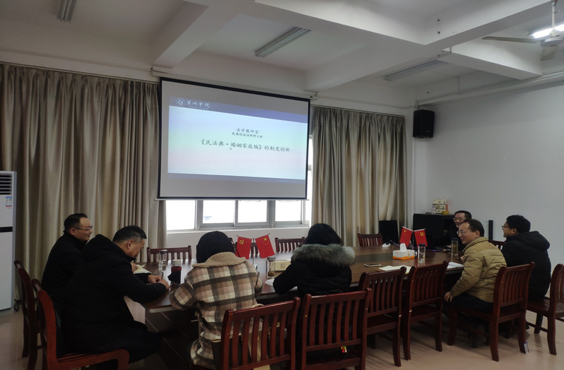 在民法典即将施行之际,法学教研室民商经济法科研小组于12月9日下午三点,在经济与法学学院三楼会议室开展相关科研活动。汪开明博士以《民法典—婚姻家庭编的制度创新》为题,为大家开展主题讲座。法学教研室全体教师参加,学院副院长施玮教授出席本次活动。