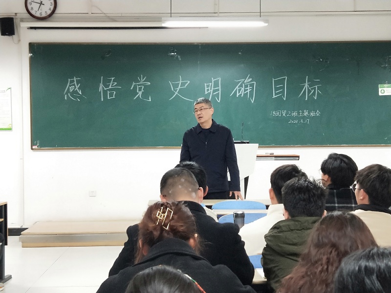 阳春三月,时光荏苒,美好而充满希望的大学生活转眼间来到第三个年头。为进一步贯彻落实学校领导联系学生制度,切实深入学生之中,真正做到了解学生所想、满足学生所需、指引学生所向。校党委副书记阮爱民于3月17日晚上走进18级国贸2班班会课堂,在中国共产党百年华诞之际与学生一起感悟党史,分享学习心得与目标。