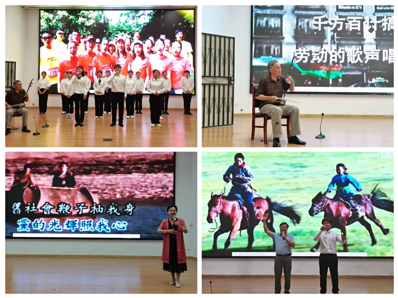 百年洽风华、歌声润心田。从一叶扁舟到巍巍巨轮,中国共产党的发展历程是一幅煌煌的历史巨篇。退休教师王万岭从开天辟地、繁荣发展、走向复兴三个篇章,采用一曲二胡演奏、一段党史讲述的方式,带领同学们共同回顾党的奋斗历程和伟大成就,现场气氛十分热烈。王老领奏,学生同唱,一曲《东方红》响彻会场,唱出了人民群众对中国共产党的眷眷深情。《没有共产党就没有新中国》、《社会主义好》、《党啊,亲爱的妈妈》等二胡独奏轮番上阵,中国共产党带领全国各族人民团结一心、艰苦奋斗,最终实现从站起来、富起来到强起来伟大飞跃的历史进程再次生动重现。王万海、19互金2班赵玉龙师生同台演绎《草原上升起不落的太阳》,将演奏会再一次推向高潮。退休教师伋麓琳更是以《唱支山歌给党听》征服现场所有人,其歌声时而悲痛凄楚,泣诉旧社会的压迫,时而壮怀激烈,充分表明人民群众跟随中国共产党闹革命的决心。《逛新城》、《共产党来了苦变甜》、《赞歌》在王万岭的精彩演奏和解说下,更是表达出少数民族同胞对中国共产党的浓烈感激之情,令人十分动容。琴声悠扬,歌声铿锵,演奏报告会在诗歌朗诵、大合唱《走进新时代》中圆满落幕,将青年学生“意气风发走进新时代”的精神面貌充分展现出来,现场掌声雷动,激扬的情绪久久不能平复。