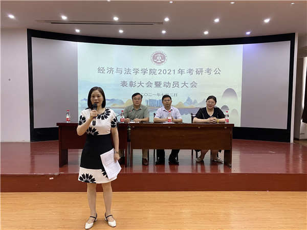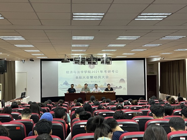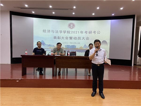 为扎实做好毕业生就业升学指导,大力推进优良学风建设,营造浓厚学习氛围,经济与法学学院于7月2日下午在博学楼2楼3D导游室召开考研考公表彰大会暨动员大会。经济与法学学院党委书记王万海、院长徐志仓、副院长施玮、党委副书记孙玮出席会议,会议由党委书记王万海主持。教师代表、各年级辅导员、2021届优秀学子代表和2022届毕业班同学参加了此次会议。