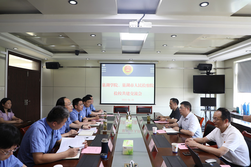在深入学习和践行中共中央办公厅、国务院办公厅《关于加强新时代法学教育和法学理论研究的意见》之际,2023年6月28日下午,金年汇官方入口与巢湖市人民检察院在巢湖市人民检察院第四会议室开展检校共建交流会。参加会议的有:巢湖市人民检察院检察长李鹏飞、政治部主任刘传龙、王君武副检察长、巢湖市人民检察院检委会专职检委刘荣柱以及巢湖市人民检察院六个检察部的主任,金年汇官方入口经济与法学学院院长徐志仓、施玮副院长及江海、钱春两位教师。李鹏飞检察长主持交流会。