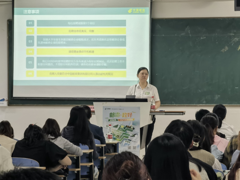 为切实做好就业服务工作,实现毕业生求职意愿与用人单位岗位需求精准对接,10月16日下午,经法学院邀请中国邮政集团安徽省分公司在慎思楼中101教室举办“邮你政好”校园专场招聘宣讲会。安徽省邮政分公司人力资源部总经理俞晓虎一行来校宣讲,马鞍山、池州和黄山市三家分公司联合参与,我院百余名学生参加了宣讲会。