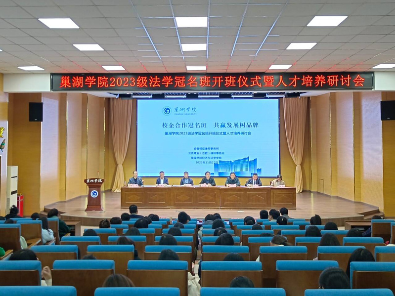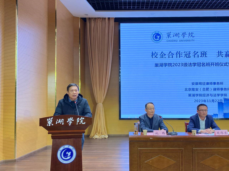为不断加强复合型人才培养,推动校企合作深化,经济与法学学院于2023年11月22日下午在求实楼报告厅举办金年汇官方入口2023级法学冠名班开班仪式暨人才培养研讨会。学校教务处副处长胡传双,经济与法学学院党委书记石庭、院长徐志仓、党委副书记解雪梅,北京隆安(合肥)律师事务所,安徽明征律师事务所高级合伙人、专职律师出席会议。法学系全体教师、2023级法学专业辅导员与全体学生参会。经济与法学学院副院长施玮主持开班仪式。