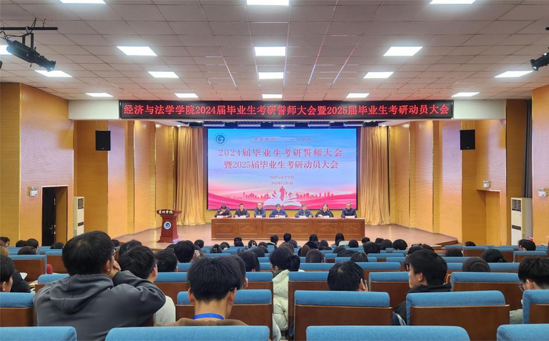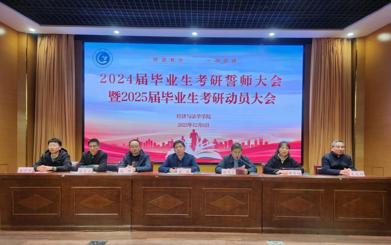 为进一步激发学生考研斗志,坚定考研信念,助力考研学子跨越“最后一公里”,12月6日晚,经济与法学学院在求实楼报告厅召开2024届毕业生考研誓师大会暨2025届毕业生考研动员大会。会议由院党委副书记解雪梅主持,院党委书记石庭,院长徐志仓,副院长施玮,各系主任,全体辅导员出席大会,2024届全体考研学生和2025届学生代表参加活动。