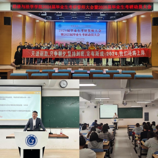 学院通过开展研究生招生宣讲会、考研专场公益宣讲会和考研动员大会,扎实推进我校毕业生就业创业工作,帮助学生准确了解考研形势,掌握相关知识,引导学生提早明确目标、科学备考。学院邀请安庆师范大学法学院副院长崔汪卫教授、邱少晖副教授一行来院开展研究生招生宣讲,不仅加强了院际的交流合作,为同学们更好地了解和掌握考研形势与政策提供了帮助。11月8日下午,校团委、经济与法学学院在慎思楼中301举办考研专场公益宣讲会,帮助学生掌握考研相关知识,引导学生提早明确目标、科学备考。12月6日晚,学院在求实楼报告厅召开2024届毕业生考研誓师大会暨2025届毕业生考研动员大会,进一步激发学生考研斗志,坚定考研信念,助力考研学子跨越“最后一公里”。