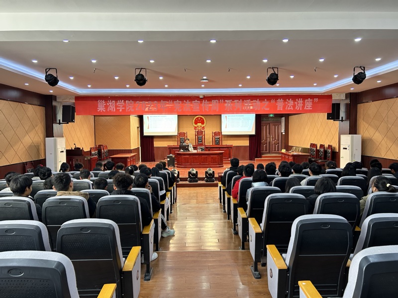 12月6日,邀请经法学院教师在模拟法庭举办宪法知识主题讲座,从宪法是什么、为什么要学习宪法、宪法的主要内容、宪法的重要性等方面进行讲述,采取以案讲法、以案学法的方式教育引导学生们树立宪法法律至上的法治理念。组织入党积极分子、青马工程学员、基层团支部学生代表走进巢湖市花山小学和卧牛山社区开展普法宣传,通过PPT动画讲解、课堂互动、分发宪法宣传单页等形式,帮助社区居民和青少年学习宪法知识,提升法治意识。