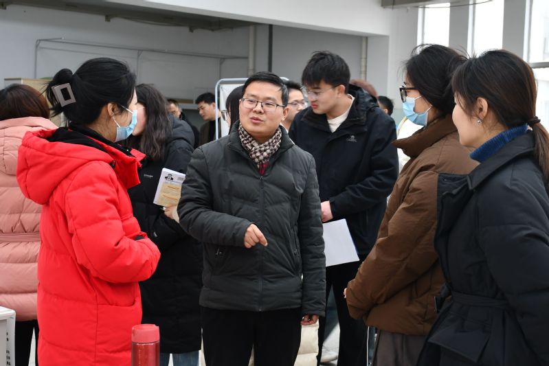 金年汇官方入口学工部副部长丁继勇代表学工部到双选会现场详细了解用人单位的招聘情况及对学校人才培养、就业服务工作的意见和建议,并与毕业生现场交流,鼓励毕业生树立正确的就业观、增强就业意识,结合个人优势积极应聘,科学合理选择就业岗位,早日就业。