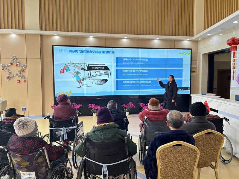 关怀暖人心,温情永传递。在九久夕阳红敬老院,党员同志们通过采访的形式科普防电诈知识,分享电信诈骗的真实案例,帮助老人更好地认识和了解电信诈骗的手段,增强防诈骗意识和自我保护能力。宣讲结束后,志愿者们和老人聊天谈心,了解他们的爱好,分享生活乐事,欢声笑语如春风暖阳,带给老人一段温暖幸福的记忆,耐心倾听他们讲述过去的故事,给予积极的回应,品味老人们的百味人生,携着三月的春风给予他们温暖和关怀,为敬老院增添了春日的温馨。
