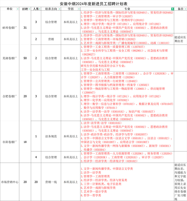 本次招聘178人,招聘单位、岗位、人数、学历及专业要求见附件1《安徽中烟工业有限责任公司2024年招聘计划表》。