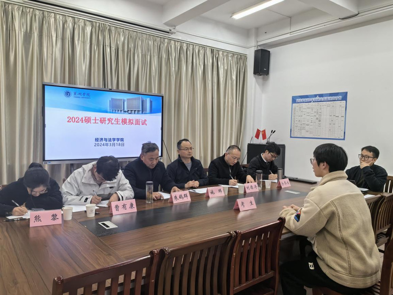 为扎实做好2024届毕业生考研指导帮扶工作,帮助学生熟悉考研复试的流程和要求,进一步提高学生复试竞争力,3月18日下午,经法学院在求实楼三楼会议室开展法学专业硕士研究生模拟面试和复试指导活动。学院副院长施玮、法学系教师朱鹤群、刘德涛、曹有康、熊黎、余冬生担任模拟考官。