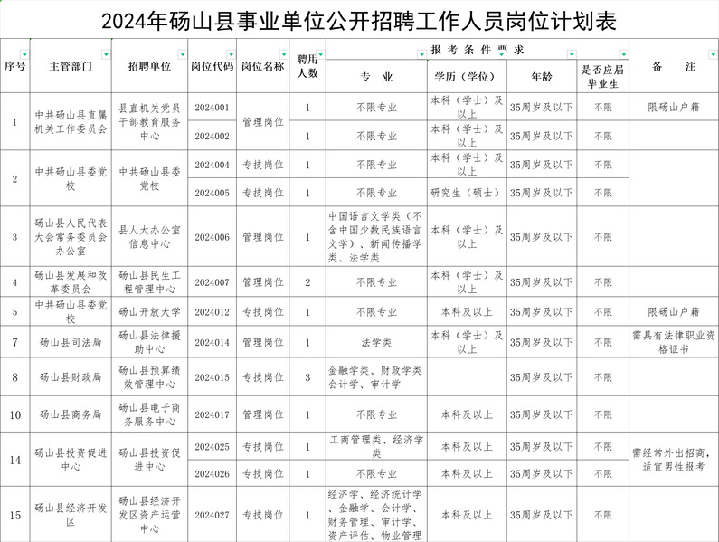 根据《事业单位人事管理条例》(国务院令第652号)、《安徽省事业单位公开招聘人员暂行办法》(皖人社发〔2010〕78号)和《关于进一步做好艰苦边远地区县乡事业单位公开招聘工作的实施意见》(皖人社发〔2017〕21号)等文件规定,现将2024年度砀山县县直事业单位公开招聘工作人员有关事项公告如下: