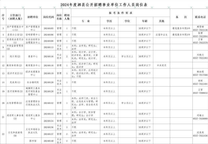 根据《事业单位人事管理条例》(国务院令第652号)、《关于印发〈安徽省事业单位公开招聘人员暂行办法〉的通知》(皖人社发〔2010〕78号)和《关于进一步做好艰苦边远地区县乡事业单位公开招聘工作的实施意见》(皖人社发〔2017〕21号)规定和要求,现就2024年度泗县事业单位公开招聘工作人员有关事项公告如下: